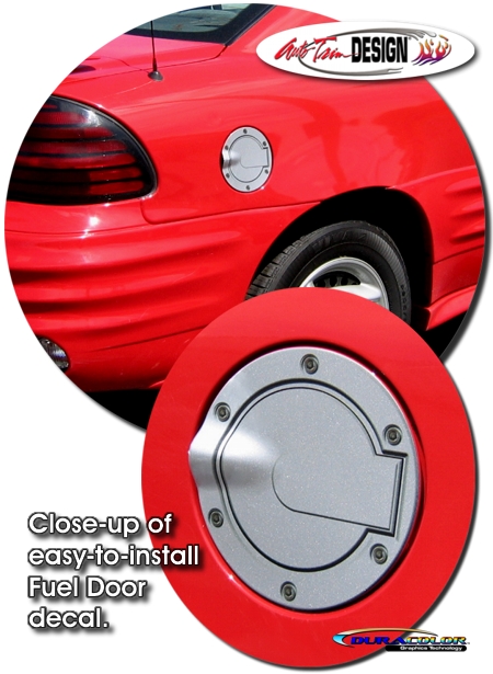 Enhance your '99-'05 Pontiac Grand Am's fuel door by adding this awesome "easy-to-install" aluminum Billet style door decal. Manufactured with a Simulated Billet composite look thermally printed onto automotive grade Silver Metallic vinyl, this three dimensional looking graphic looks like it's fastened on with Stainless Steel Hex Head style fasteners!