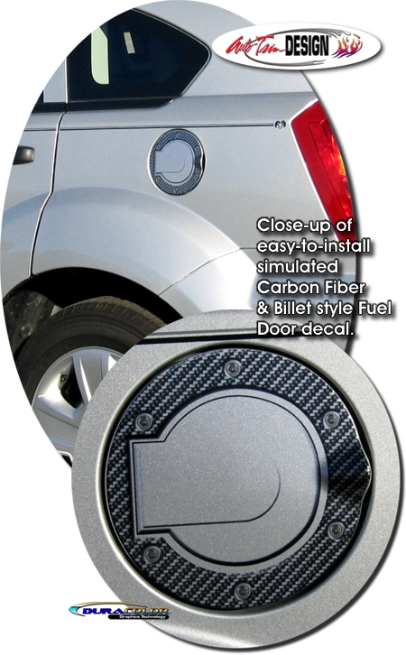 Enhance your '07-Current Dodge Caliber's factory fuel door by adding this awesome "easy-to-install" aluminum Billet style door decal. Manufactured with a Simulated Carbon Fiber and Silver Metallic composite look thermally printed onto automotive grade Silver Metallic vinyl, this three dimensional looking graphic looks like the door is fastened on with Stainless Steel Hex Head style fasteners!